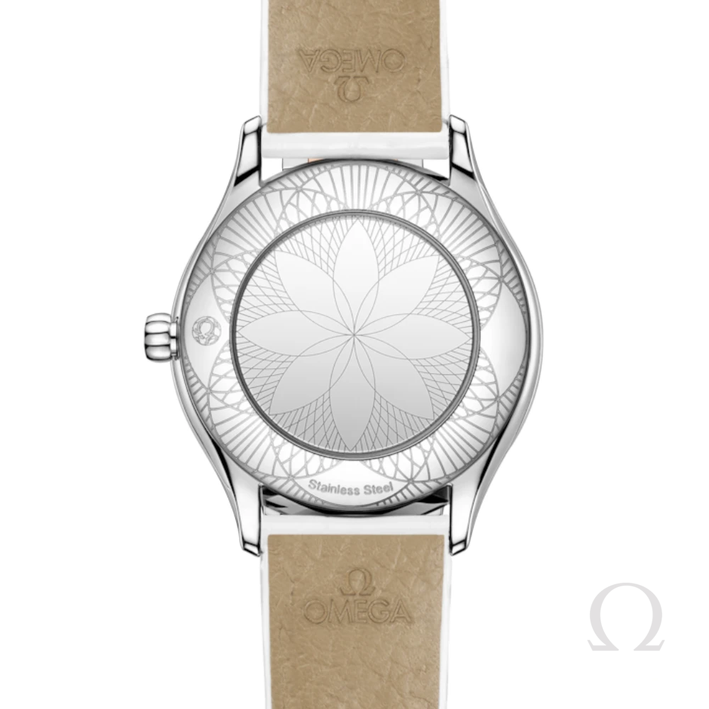 Mẫu đồng hồ này bằng thép không gỉ có vỏ 26 mm với những viên kim cương cong thanh lịch dọc theo mỗi bên. Ngoài ra còn có một viên kim cương duy nhất được đính trên núm vặn, được bao quanh bởi một bông hoa gốm lai màu đỏ. Mặt số hình vòm được chế tác bằng men “Grand Feu” màu trắng đục và được tô điểm bằng các chữ số La Mã chuyển màu xám.