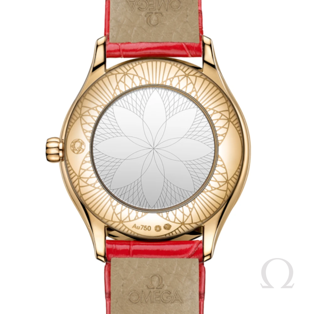 Mẫu đồng hồ này bằng vàng Moonshine™ 18K có vỏ 26 mm với những viên kim cương cong thanh lịch dọc theo mỗi bên. Ngoài ra còn có một viên kim cương duy nhất được đính trên núm vặn, được bao quanh bởi một bông hoa gốm lai màu đỏ. Mặt số hình vòm được chế tác bằng men “Grand Feu” màu trắng ngà và được tô điểm bằng các chữ số La Mã chuyển màu đỏ.