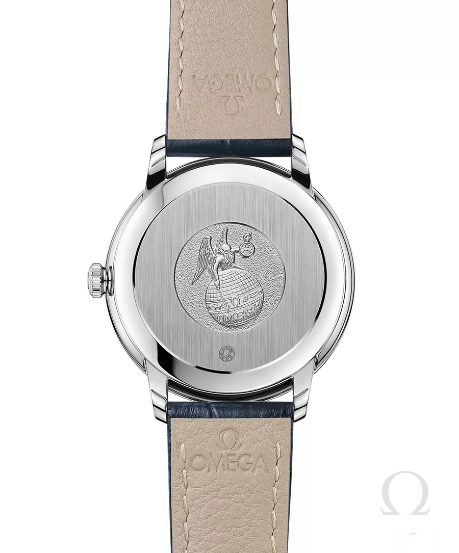 Vỏ 32,7 mm được làm bằng thép không gỉ và đi kèm dây đeo bằng da màu xanh lam. Trái tim của chiếc đồng hồ này là bộ máy Co-Axial Calibre 2500.