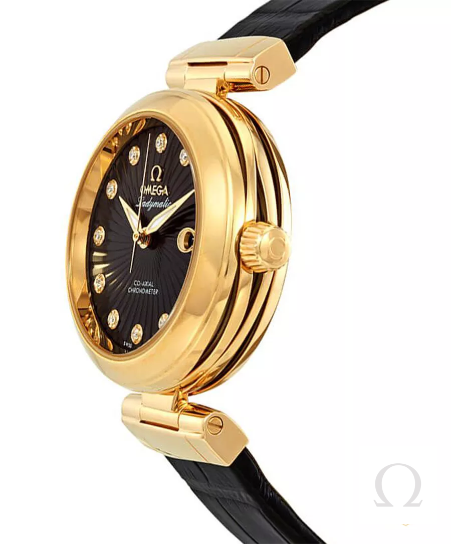 Chiếc OMEGA Ladymatic này có mặt số màu đen được đánh dấu bằng các cọc số đính kim cương và được trang trí theo mô hình siêu tân tinh với cửa sổ ngày ở vị trí 3 giờ. Mặt số tinh tế có thể nhìn thấy được qua tinh thể sapphire chống trầy xước. Vành bezel được gắn trên vỏ vàng hồng 18K đường kính 34 mm trên dây đeo bằng da màu đen.