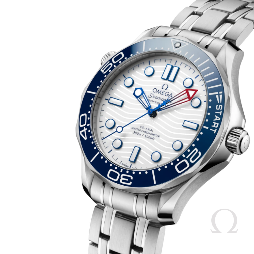 Để kỷ niệm vai trò là Người bấm giờ chính thức của OMEGA tại America’s Cup lần thứ 37, OMEGA đã sản xuất chiếc Seamaster Diver 300M ấn tượng này với thang đo regatta và mặt sau kỷ niệm. Chiếc Seamaster Diver 300M 42 mm bằng thép không gỉ có vành bezel một chiều bằng gốm màu xanh lam với thang đo regatta, bao gồm hai phần trước khi bắt đầu 5 phút và phần BẮT ĐẦU với lá cờ lấy cảm hứng từ regatta. Mặt số bằng gốm trắng mờ được khắc bằng laser với các đường sóng nổi. Kim giây trung tâm có quả cân đối trọng là chiếc cúp America’s Cup cùng màu xanh với logo Barcelona. Logo màu xanh lam đặc biệt này, với “Auld Mug” và chữ B viết tắt của Barcelona, ​​cũng nằm trên mặt sau bằng tinh thể sapphire. Chiếc đồng hồ được cung cấp năng lượng bởi Bộ máy đồng trục Master Chronometer Calibre 8806 của OMEGA. Mẫu đồng hồ này có dây đeo bằng thép không gỉ với hệ thống Thay đổi nhanh được cấp bằng sáng chế của OMEGA và được đựng trong hộp màu xanh lam kỷ niệm với đường khâu màu đỏ. Khoảng cách giữa các vấu 20 mm. Khoảng cách từ vấu này đến vấu kia 49,9 mm. Độ dày 13,8 mm. Đường kính vỏ 42 mm. Vỏ thép. Màu mặt số Trắng. Mặt kính sapphire chống xước hình vòm có lớp phủ chống phản quang ở cả hai mặt. Khả năng chống nước 30 bar (300 mét / 1000 feet). Tổng trọng lượng sản phẩm (xấp xỉ) 196 g. Calibre Omega 8806. Kiểu chuyển động Tự lên dây cót. Dự trữ năng lượng 55 giờ